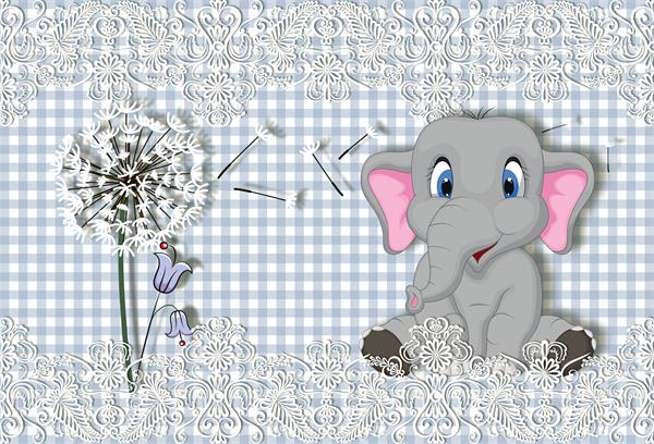 تصویر کودکانه پس زمینه چهارخونه آبی با نقش های سفید و فیل وقاصدک