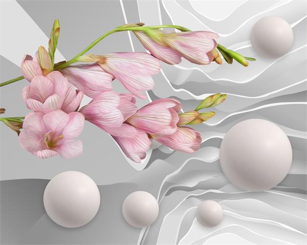 تصویر سه بعدی گل صورتی و دایره در پس زمینه سفید