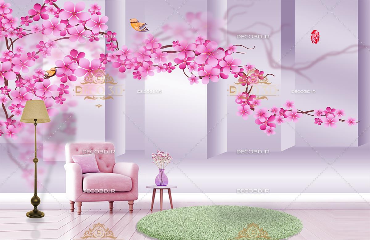 شکوفه های صورتی و پرنده های زرد
