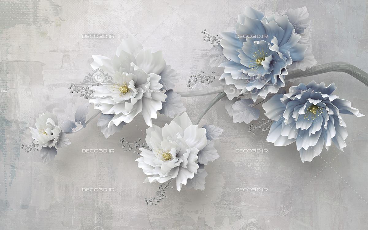 گلهای آبی و سفید برجسته روی شاخه درخت