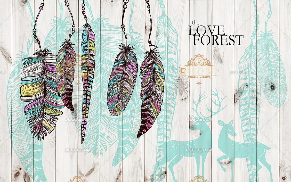 پرهای رنگارنگ با زمینه چوبی و نقش گوزن
