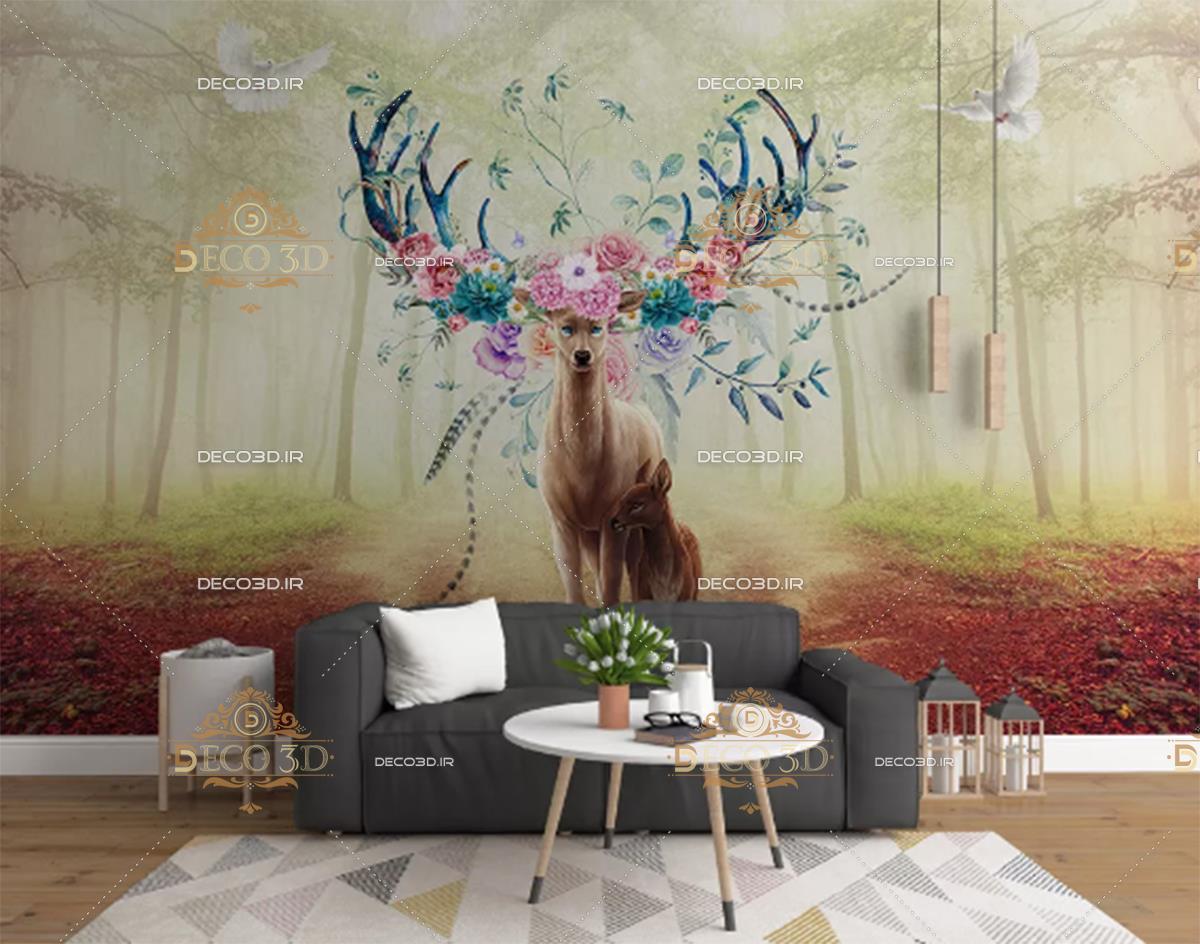 گوزن با شاخهای گل آویز در جنگل