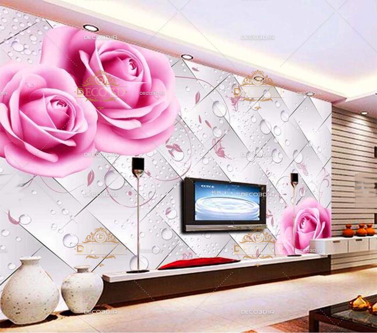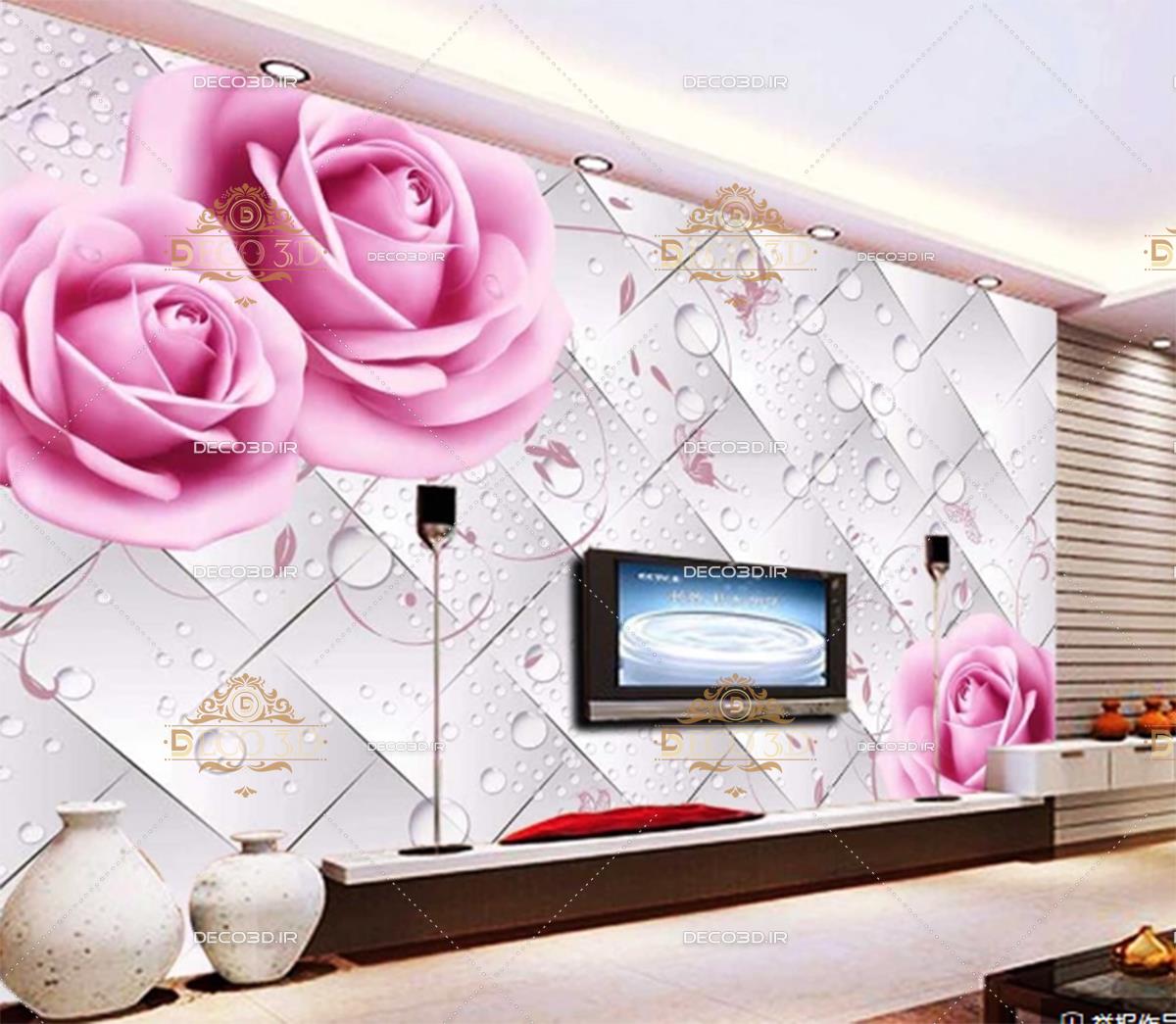 گلهای رز صورتی و قطرات آب با زمینه طرحدار