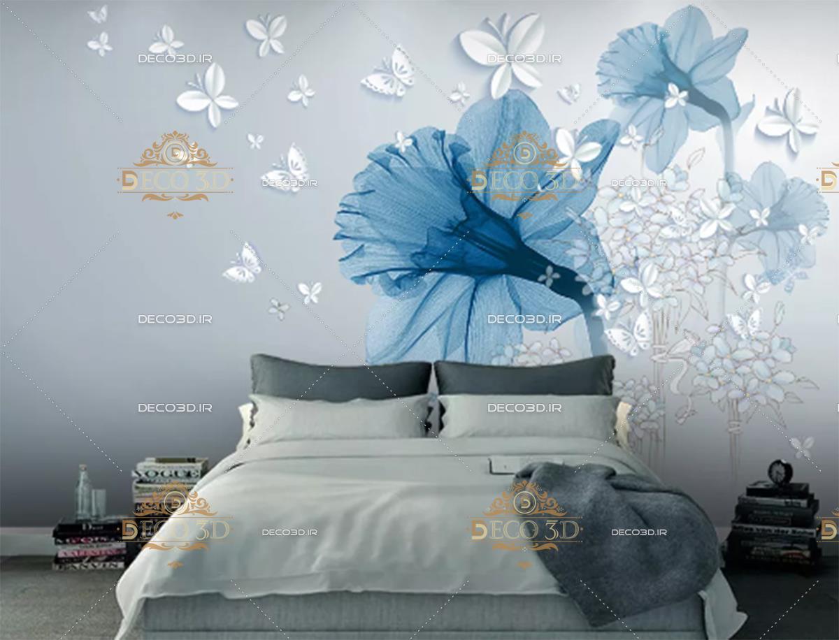 گل های شیپوری آبی و پروانه های سفید برجسته