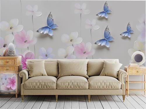 پروانه های آبی و گلهای صورتی برجسته