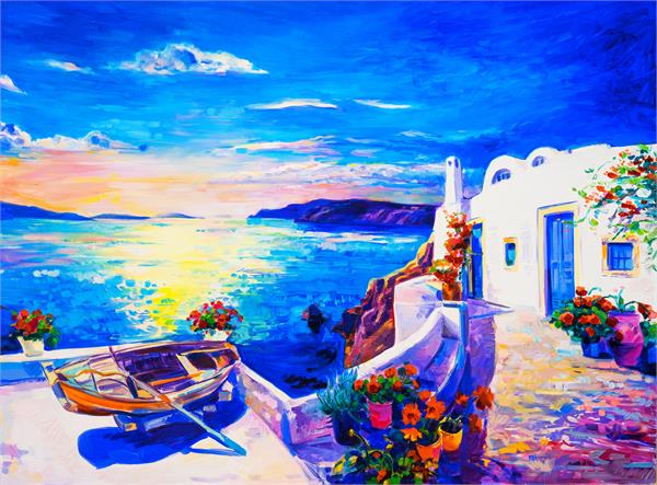 نقاشی خانه در کنار دریا و قایق