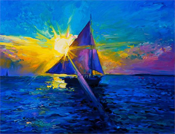 نقاشی آسمان افتابی و قایق روی دریا