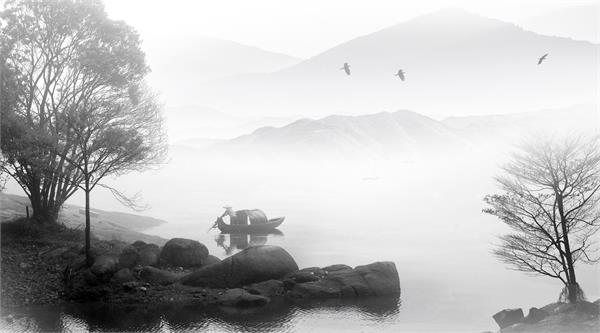 تصویر سیاه و سفید طبیعت و قایق روی آب