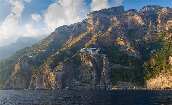 منظره ی لنج و شهر ساحلی با کوه و کلیسا