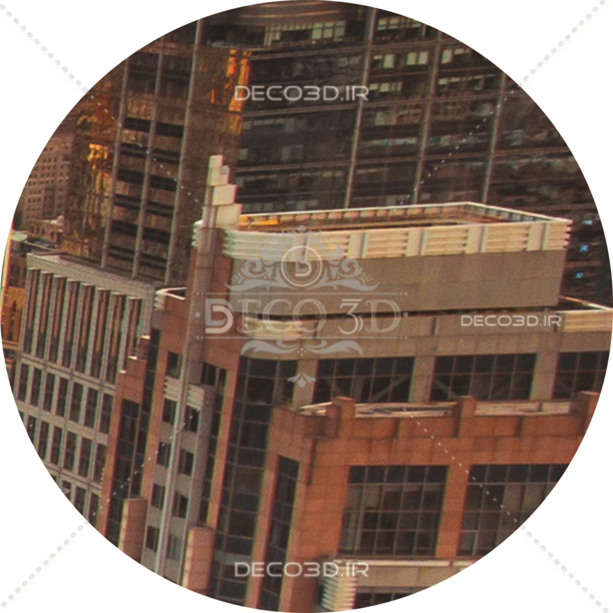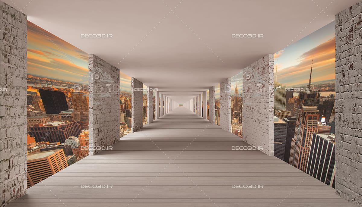 راهرو طولانی با منظره شهر و ساختمان ها در غروب