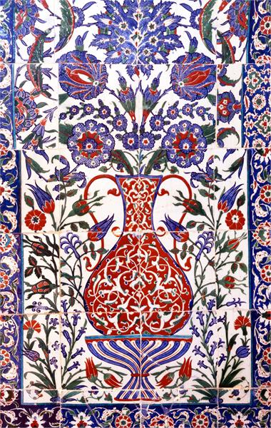 کاشی کاری طرح قاجار با گلهای آبی و قرمز