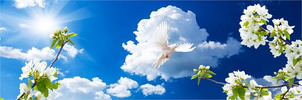 گلهای سفید و شاخه سبز با آسمان ابری