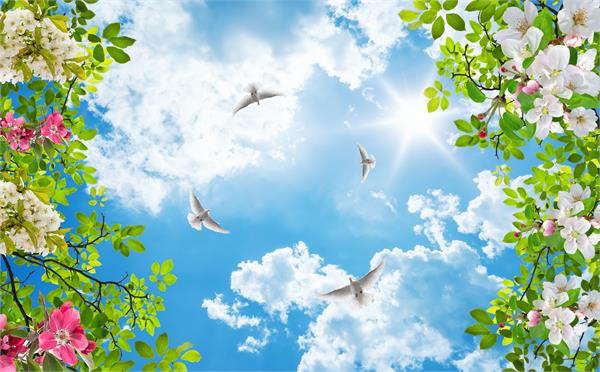 کبوترها در آسمان و شکوفه های صورتی
