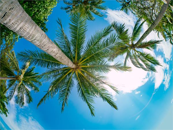 آسمان آبی و خورشید و ابرها با برگ درختان
