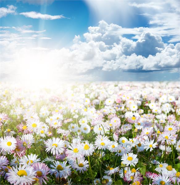 آسمان آفتابی و دشت مملو از گلهای سفید