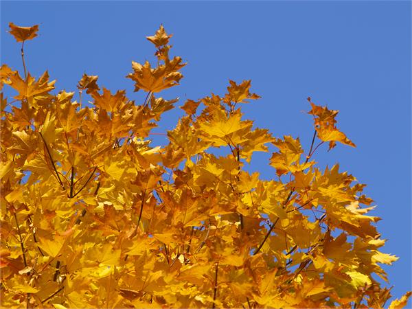 آسمان آبی و برگ های پاییزی