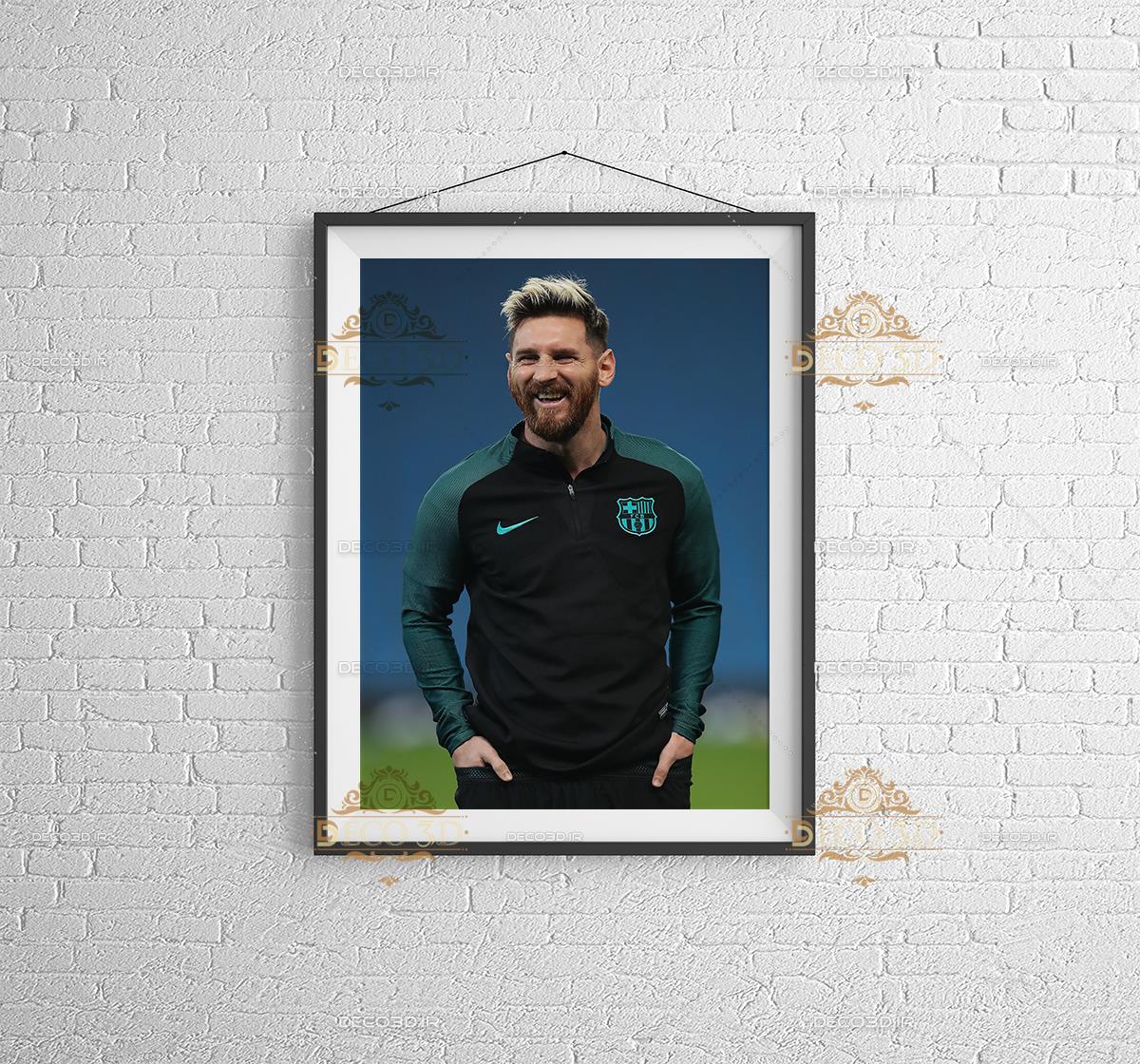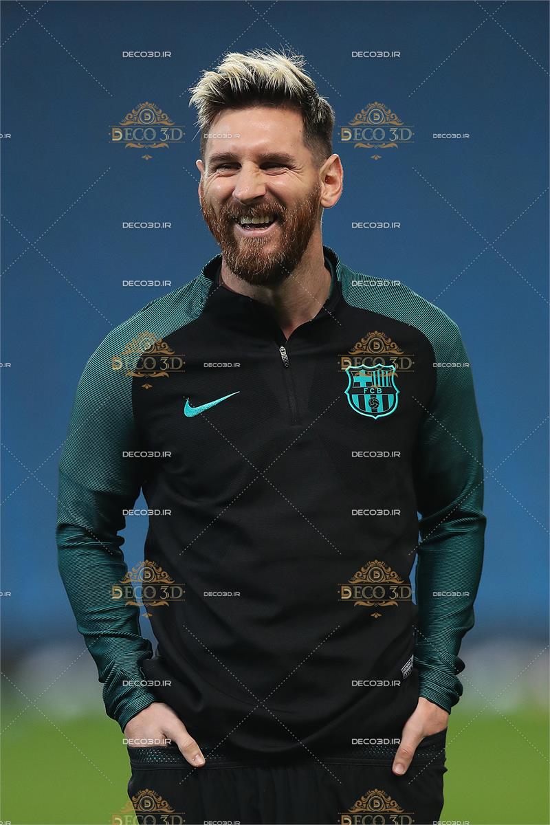 پرتره نشسته لیونل مسی با لباس اسپرت همراه با توپ فوتبال