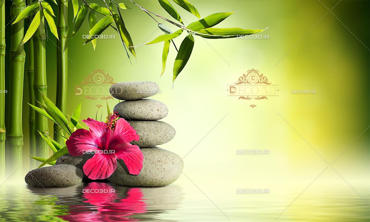 سنگها و گل در برکه با گیاه بامبو